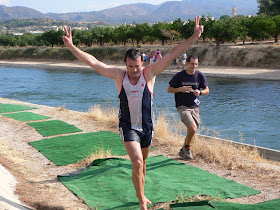 A les 10h han donat la sortida i quina sortida, tots a l'aigua i cops i més cops ( pregunteu -li a Mauro )tothom buscava el seu espai per nadar amb les millors condicions, he sortit en la posició 42 de l'aigua molt fatigat i marejat i tot, però mentre feia la transició he vist com el meu germà que havia sortit en la 25ª posició començava en bici, m'he canviat en un obri i tanca d'ulls i...... al damunt de la bici, he començat adelantar a gent amb bastanta facilitat fins que he atrapat al meu germà que anava més tocat que jo, s'ha ficat a la meva roda i en uns kilometres s'ha recuperat, seguíem atrapant a gent i de sobte......el jesusenc, ja era meu, havia sortit de l'aigua dels 15 primers i la veritat és que anava molt bé, tot sigue dit, però el vaig passar dient-li: