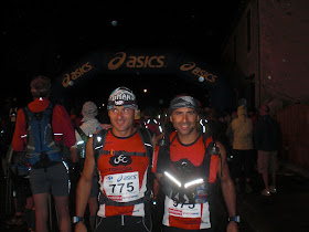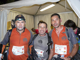 Vam començar molt bé, sempre els 2 junts ( els germans roqueteros ) anavem a un ritme bo i menjant cada 1h 15 min i bebent molt freqüentment sals i aigua fins que al km 30 va passar el que no tenia que passar i és que després del avituallament se'm va ocurrir preguntar-li la posició a la del control i em va dir que anavem 8º i 9º de la cursa, va ser llavors quan el meu cap va començar a sortir-li la " vena competitiva " i li vaig dir al meu germà que tenia ganes d'arrencar, tinc cames li vaig dir, creus que pots afrontar la resta de cursa sol??? Em va dir que tires que ell aniria fent, li vaig dir que regules be i que no olvides el menjar i el beure i que sigues prudent ja que quedava més d'una marató per endavant i me'n vaig anar en buscar de no sé el què, la veritat no estava preparat per afrontar esta cursa però de cop i volta m'havia fotut en un fregao de cuidado, vaig començar a pujar el segon port de 8km tot corrent, caminant poc i quan vaig arribar al contol del coll km 37.5, em diuen que vaig 4º i que el 3º esta a 15min "m'envalentono" i començo a baixa fort fins km 44, allí al control em diuen que la diferència és de 15 min i ho deixo anar, era tard, no calia patir com un boi,g ja que els 3 de davant eren molt bons corredors el que va quedar 3º l'any anterior havia quedat 33º classificat al utmb i jo no estava ni físicament ni mentalment preparat per portar aquell ritme fins al final, vaig afluixar el ritme però mantenint la bona posició fins al final.
